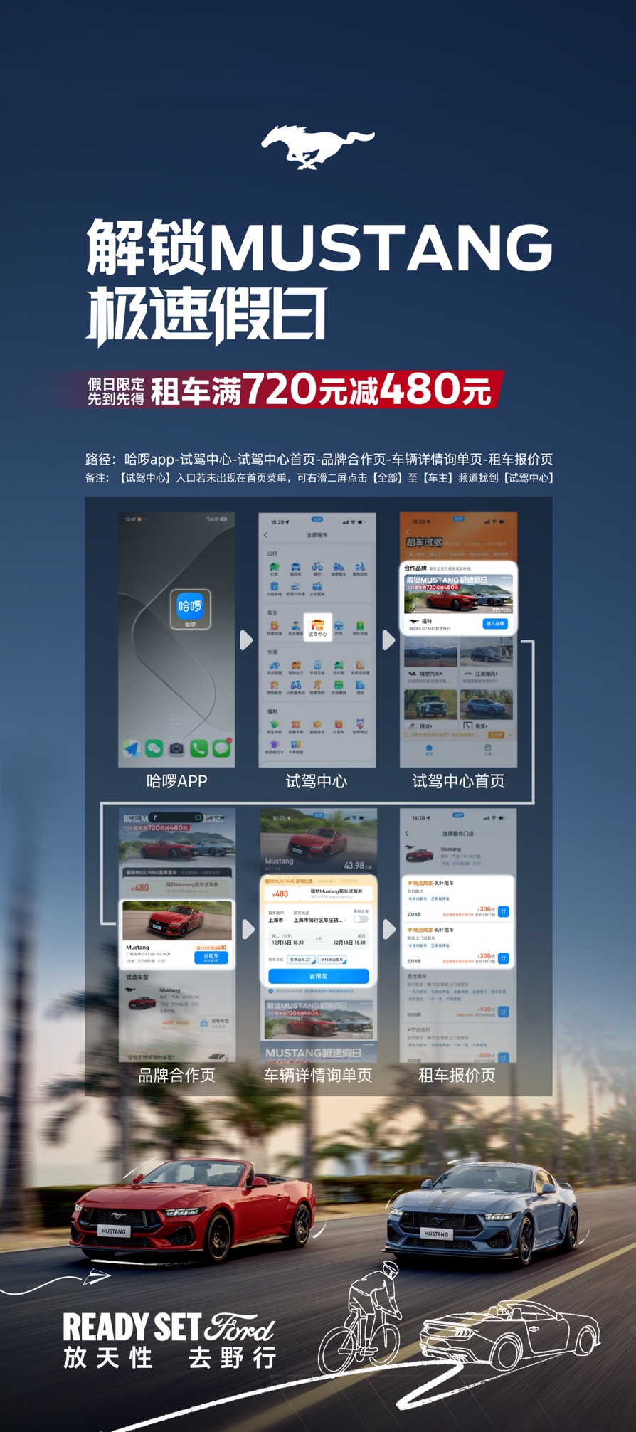 活动启动伊始,在为期3个月的推广期内,福特中国和合作伙伴为全国的性能跑车爱好者准备了限时惊喜福利:覆盖圣诞、春节及情人节等多个假期集中的租赁高峰时段,用户均可享受“满720元减480元”的单天车辆租赁费用优惠,助力假期用户畅享Mustang极速假日。