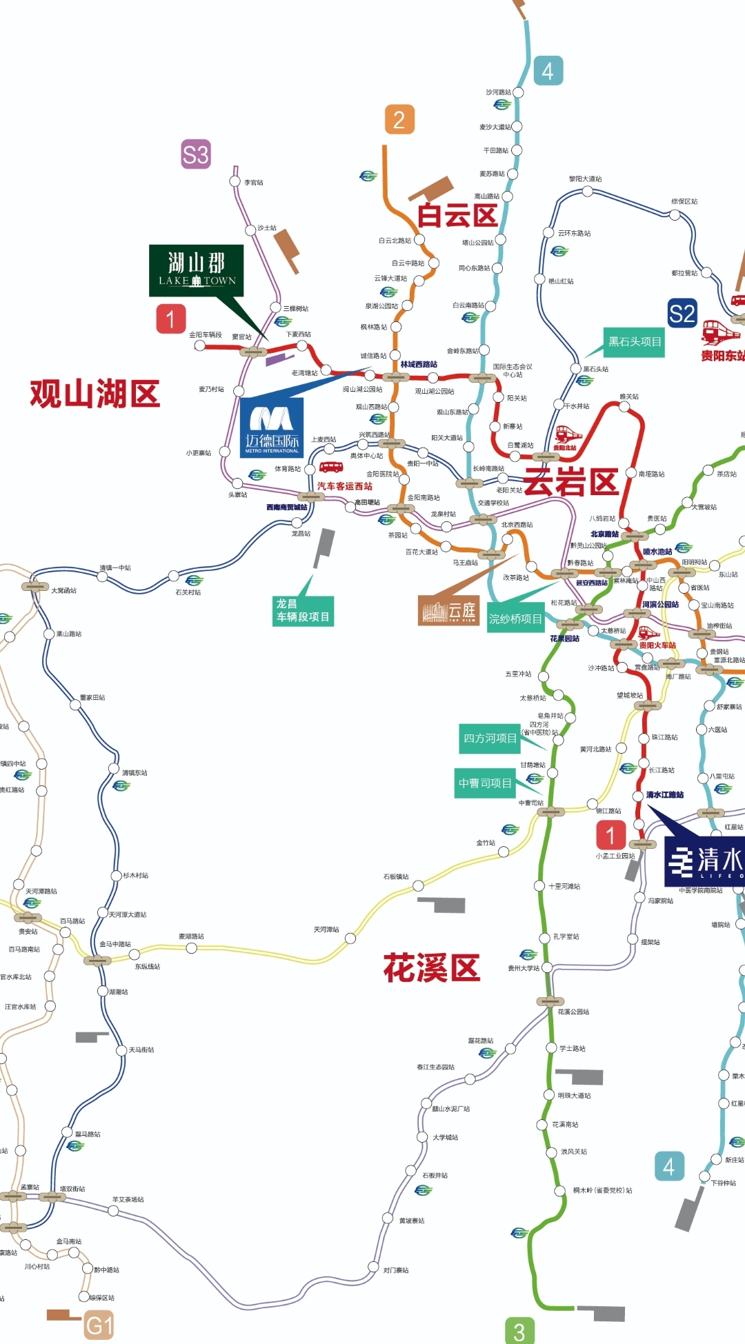 而地铁S2号线,虽然是一条郊区线路,但是,它经过的区域,却都并不“郊区”,从贵安新区的马场,磊庄等板块,穿过贵安新区核心片,和S1在大数据科创城板块的金马中路相交换乘,然后延清镇东侧板块一直北上,经过清镇东站、董家田、栗山路等,再横向朝观山湖方向驶去,经过清镇一中,石关村、龙昌等站点,进入观山湖的西南商贸城。