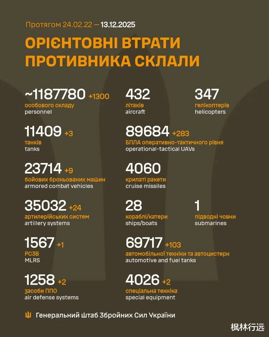 乌总参公布的昨日战果,歼敌(毙+伤)1300人。