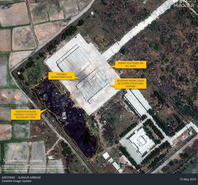从美国公布的卫星图可以看出,巴基斯坦至少有五个空军基地被炸得够呛,机库被掀翻、跑道变“月球表面”,甚至连中国造的翼龙无人机都没能幸免。