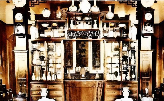 住宅里有个房间,正中间的百宝架上摆着各种各样的古玩瓷器。架子前面放着香炉,架子两头各挂着一个摆钟,这摆钟应该是古物,不是用来报时的。从这些大小不一的计时工具能看出黄金荣挺喜欢钟表的。