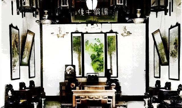 厅里放着中堂、字画、椅凳这些东西。陈设比别的厅堂简单些,不过看着简洁又雅致。