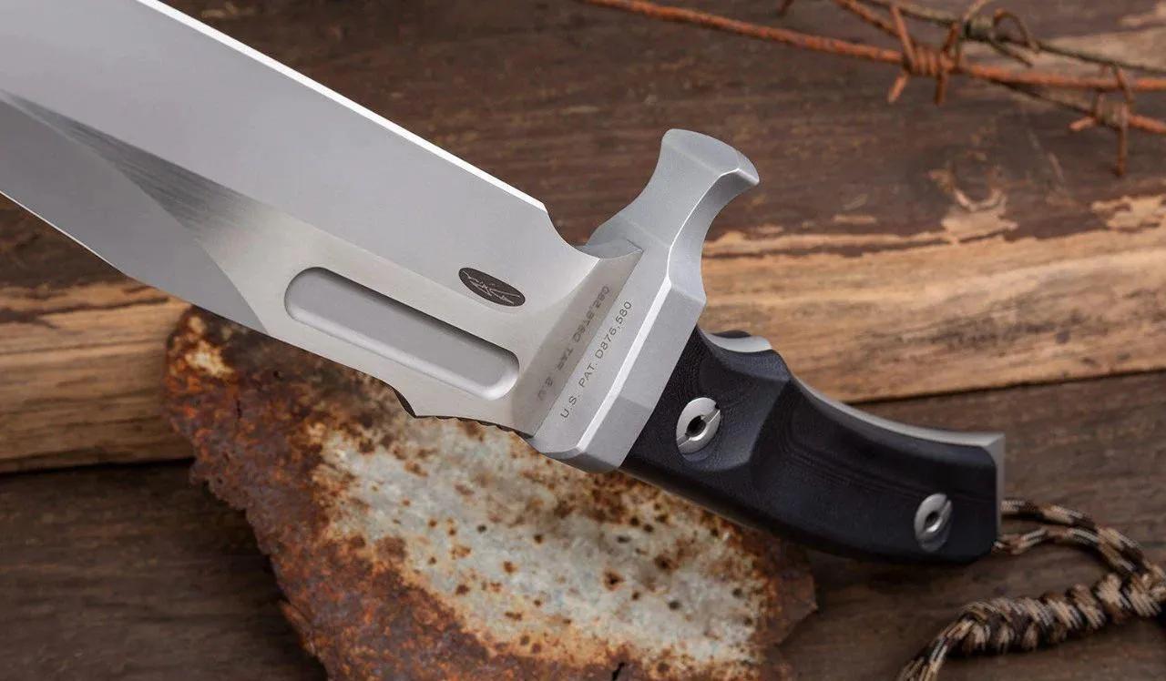 一体化龙骨刀身延伸到刀柄尾部之外,形成了独特的尾锥造型,绰号“头骨破碎机”。这一设计不同于一般刀具保留厚实的尾部用来敲砸。MK8和MK9的尾部形成尖锐的假刃样式,除了敲砸外,尾部的尖端可以轻松击破物体。在野外生存中,当需要打破坚硬的物体,如冰块、坚果壳等时,这个尖锐的尾部就能发挥巨大的作用。在刀尾还有隐藏式的穿绳孔,用户可以根据自己的需求系上绳索,方便携带或进行特殊的操作。