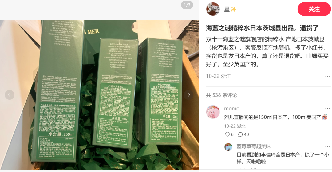美妆产业圈注意到,关于海蓝之谜、雅诗兰黛产品产自日本的讨论,最早于10月22日前后在小红书平台出现。