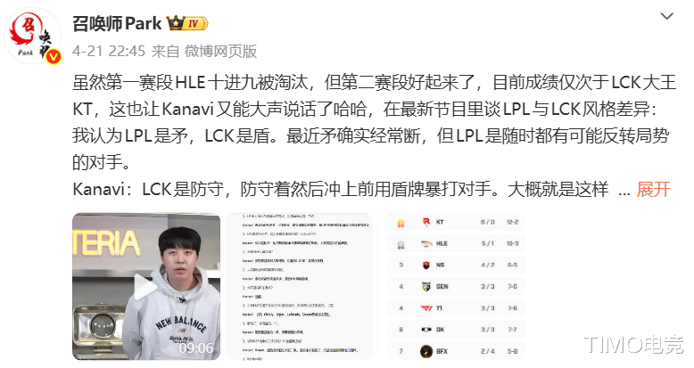 我每天都想攻击对手,我是LPL风格的矛近日,HLE官方发布治愈食堂Kanavi篇的物料视频,这位曾效力LPL多年的打野在接受采访时,提出了“矛与盾”的相对论:“我认为LPL是矛,LCK是盾。最近矛确实经常断,但LPL是随时都有可能反转局势的对手。”“我是LPL风格的矛。”引起网友热议