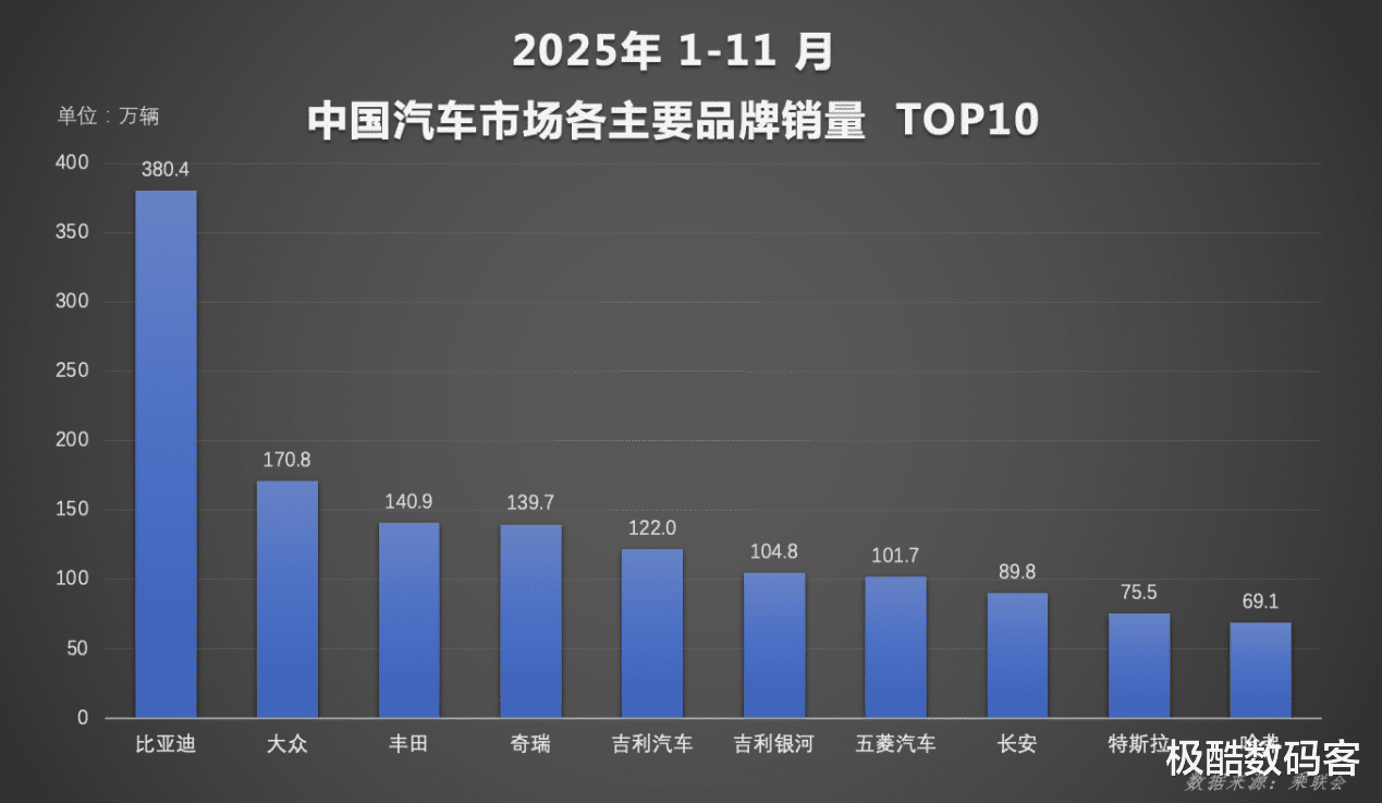 比亚迪表现亮眼持续领跑!从累计数据看,2025年前11个月比亚迪累计销量达418.2万辆,同比增长11.3%,年度销量目标完成率已超九成。随着12月市场冲刺阶段到来,比亚迪有望超额完成全年目标。