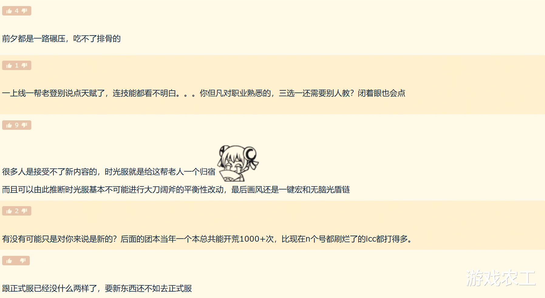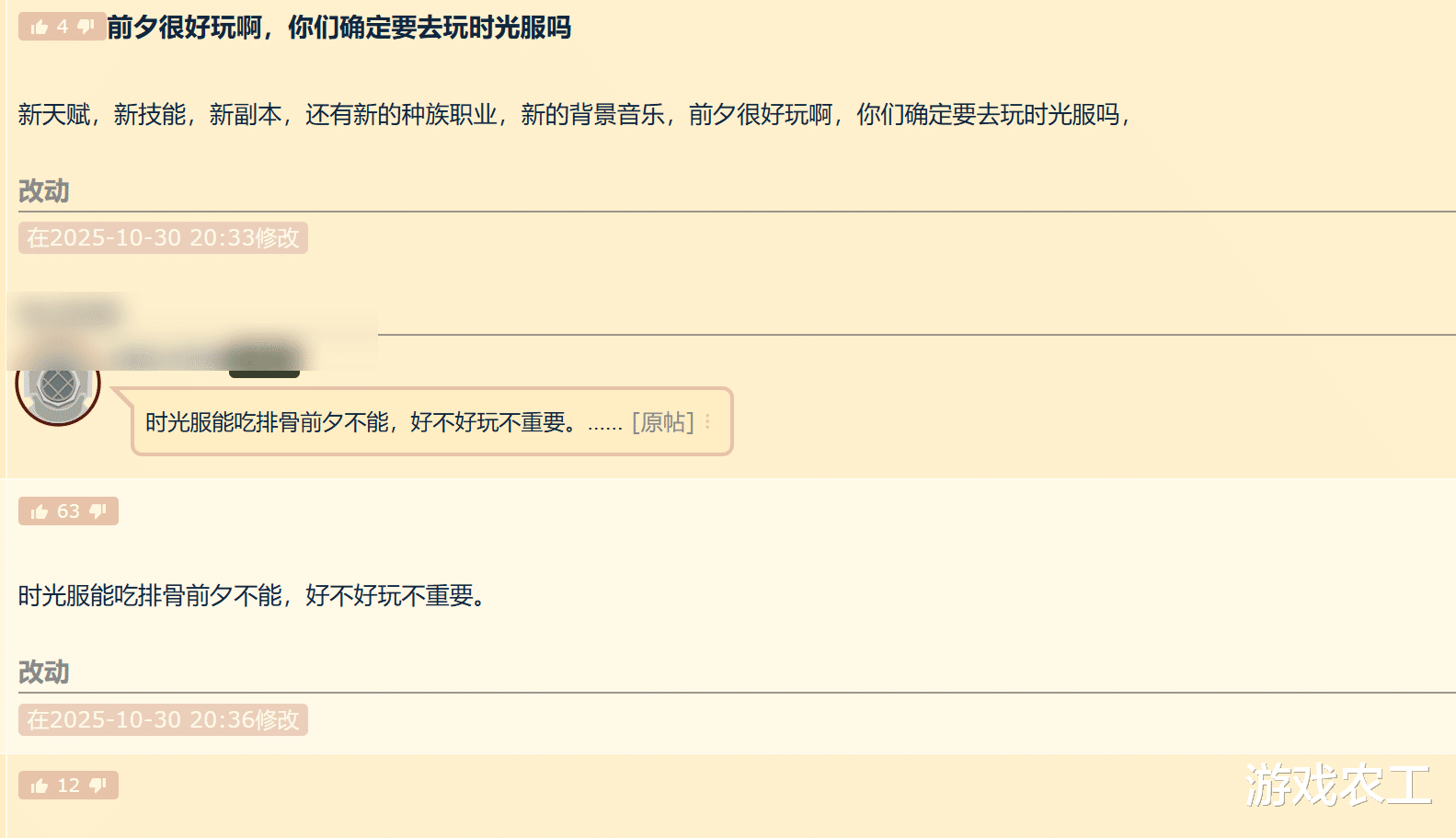 论坛中有个玩家发了一个帖子:“前夕很好玩,你们确定要去玩时光服吗?”而给出的理由是新天赋、新技能、新副本,还有新的种族职业、新的背景音乐,以此说明前夕很好玩。农工自己体验了下前夕的版本内容,确实感觉比较不错,但是本质上还是为了等待时光服的到来。而下面的一个评论引起了农工的注意:“前夕不能吃排骨,而时光服可以。”