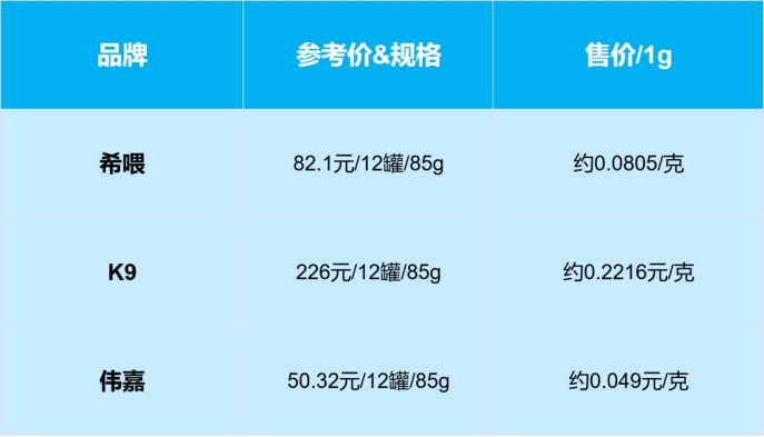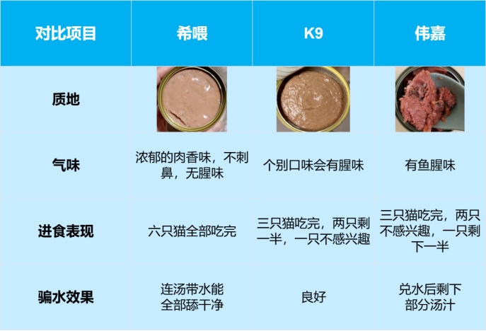 【对比结果】:希喂 ★★★★★ | K9 ★★★★☆ | 伟嘉 ★★★☆☆