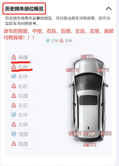 受损部位:若涉及车身框架(纵梁、横梁、A柱、B柱)、发动机、变速箱等核心部件,说明车辆可能存在结构性损伤。警示信号:报告中出现“大梁变形”“A柱切割”“防火墙更换”等描述,需直接排除该车。
