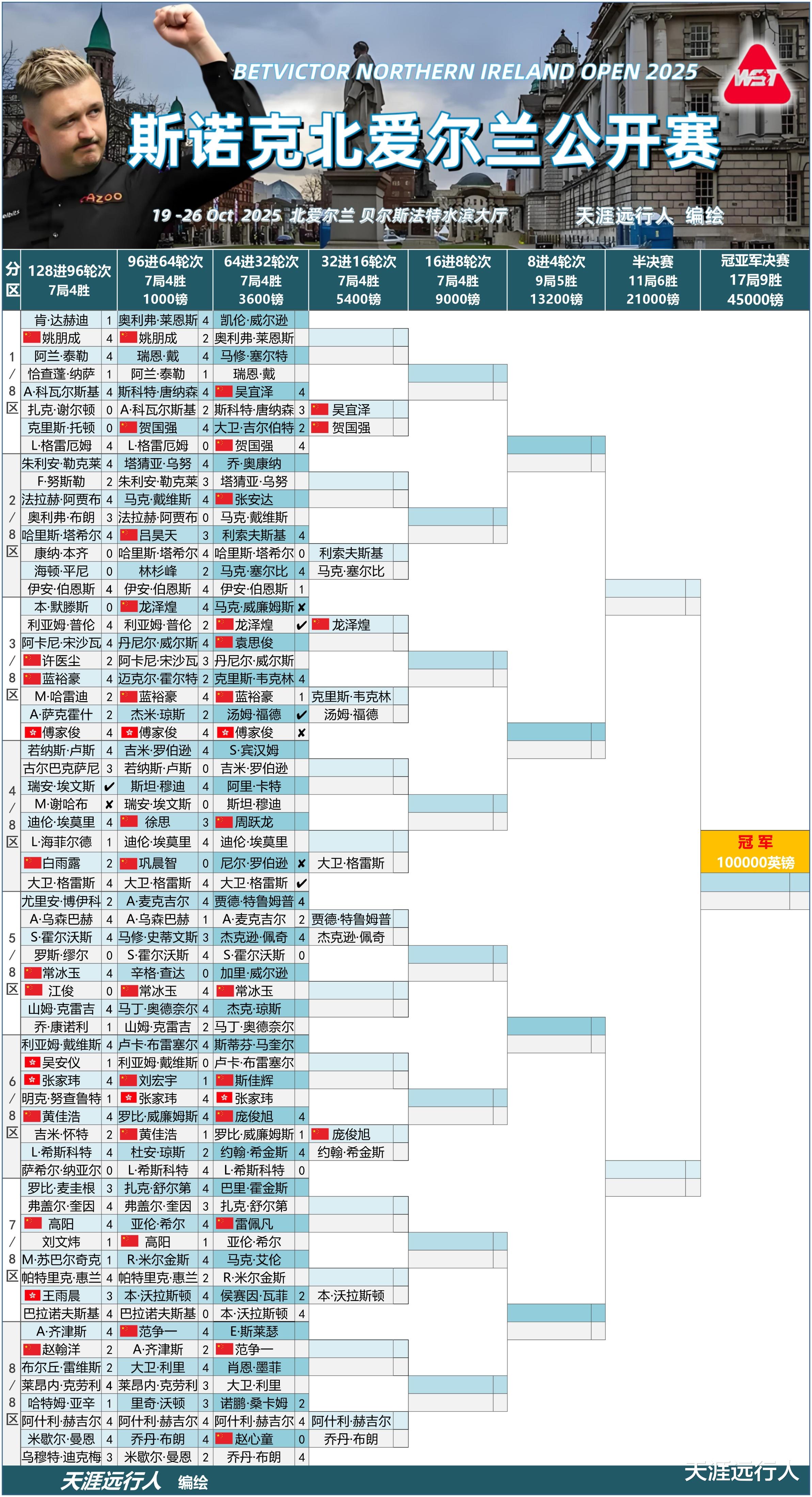 最新即时更新2025斯诺克北爱尔兰公开赛进程签表,一表看北爱赛全程,各位看官老师敬请转发收藏,以备不时之需