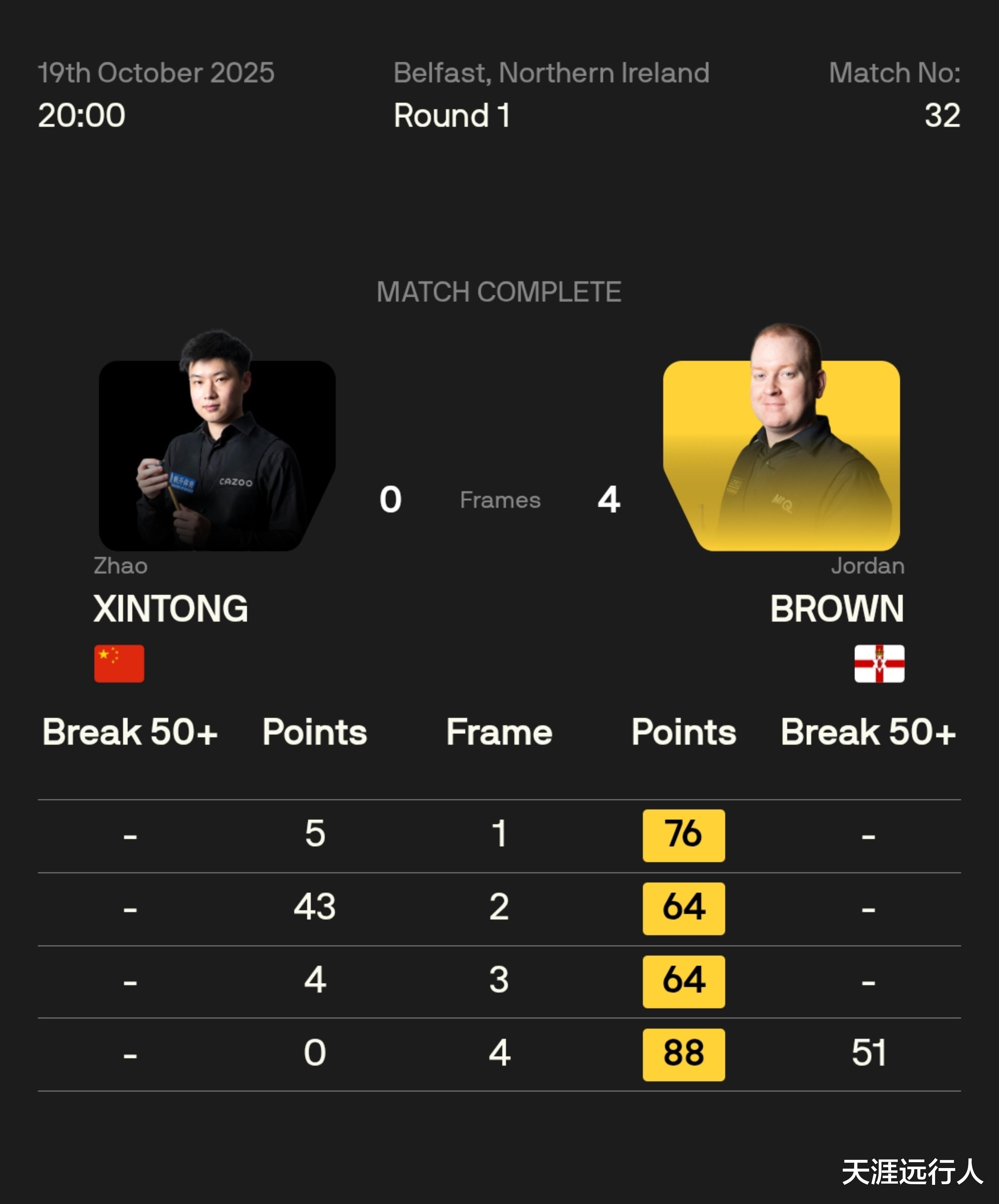 本场比赛对面的乔丹·布朗,并非哪方的神圣,虽然曾力压火老师夺得2021威尔士公开赛冠军,拿到生涯唯一一个排名赛冠军,但包括这一场跟赵公子的卖惨之争,真的是乏善可陈。