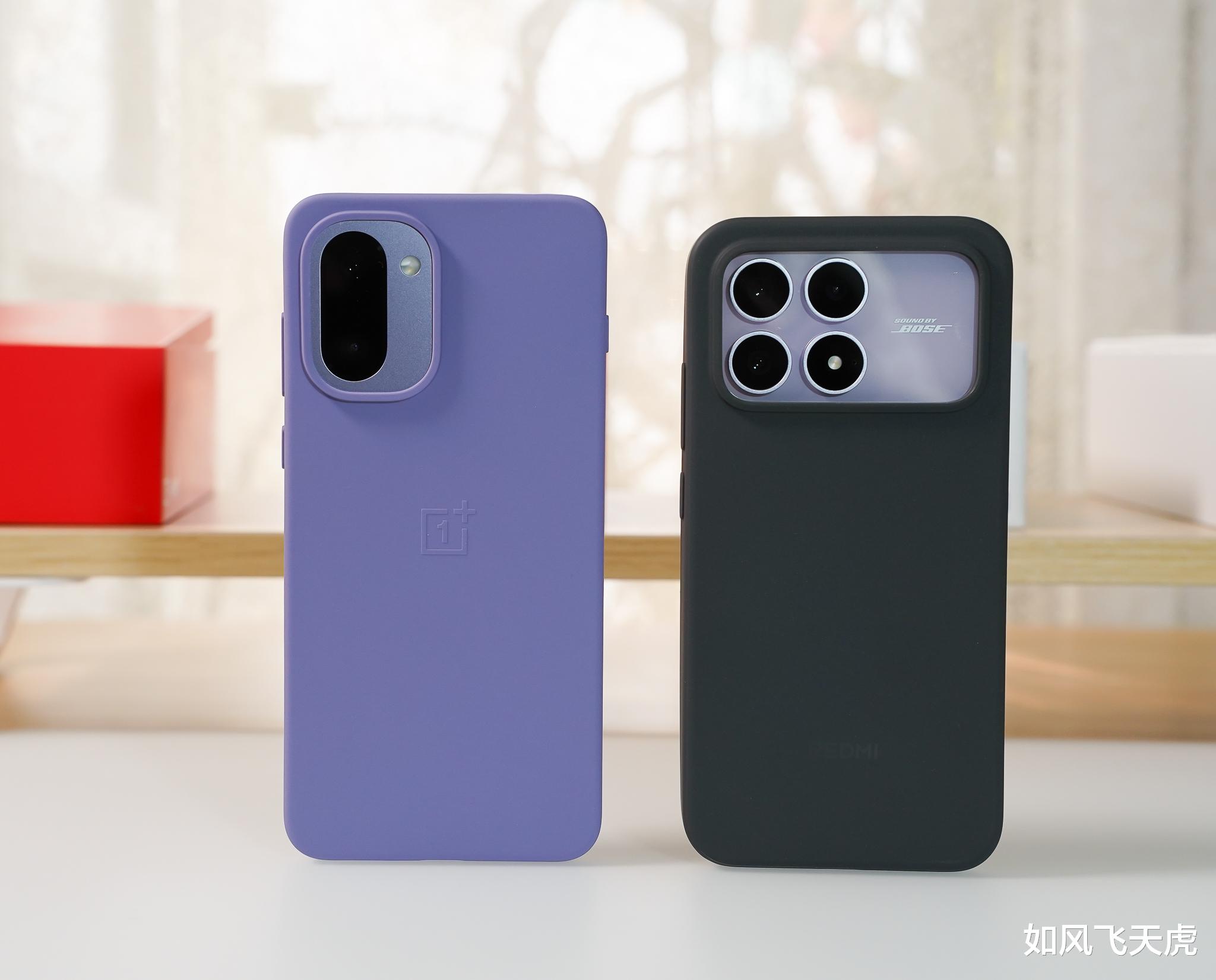 套上随机的手机壳,一加Ace 6T是紫色的,同配色很搭;而红米Redmi K90是黑色的壳,套上感觉很奇怪。