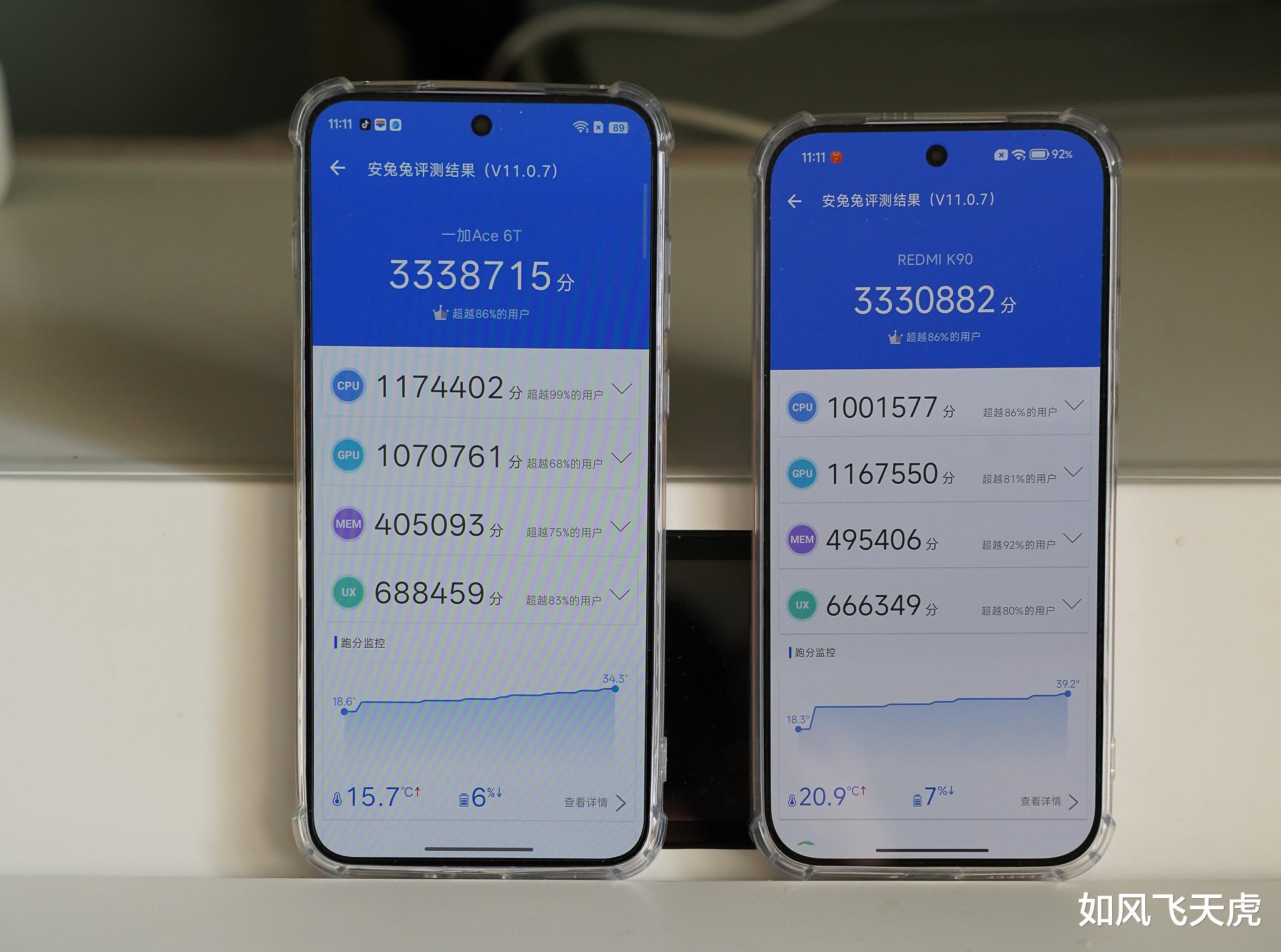 散热方面,上图是双方的宣传资料。从实际效果看,一加Ace 6T的散热效果更好一些。例如上面安兔兔测试一圈下来,一加Ace 6T的温度是18.6°C到34.3°C,而红米Redmi K90则是从18.5°C到39.2°C,前者温升是15.7°C,后者温升是20.7°C。