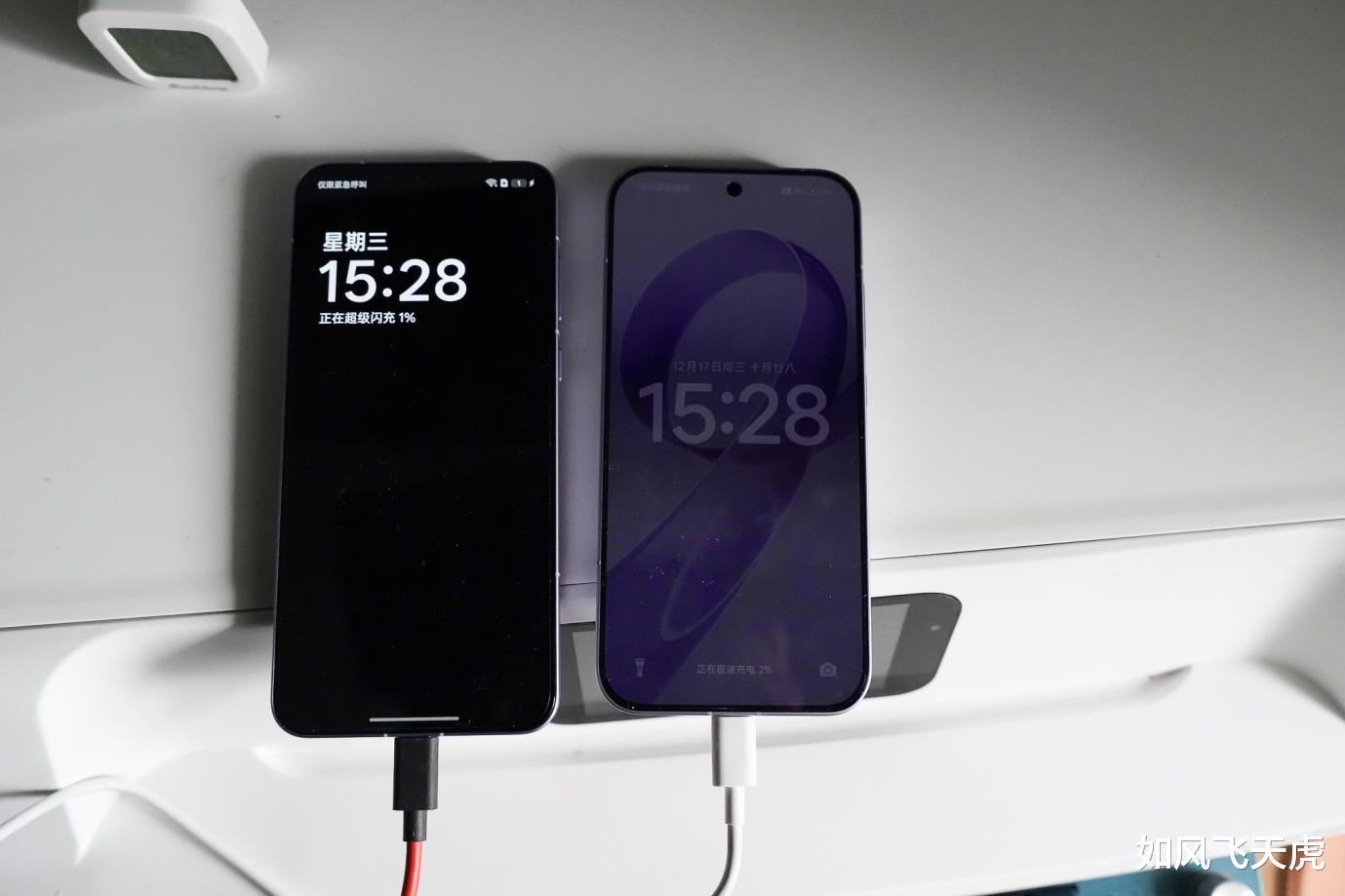 充电方面,2个手机都配备了100W快充。从1%开始充电,此时下午3点28分。