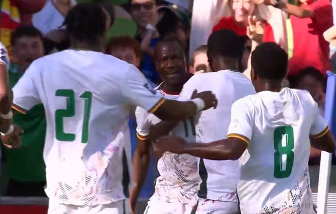 国足退防变为五后卫,喀麦隆推进到前场,纳吉达边路一脚斜传球送到国足禁区内,艾永跟进直接推射破门得分,门将颜骏凌,三中卫吾米提江、朱辰杰、刘浩帆只能目送对方打进。