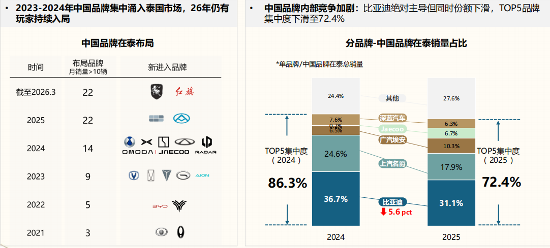 2021年,泰国市场月销超10辆的中国品牌仅3个,2026年这一数字涨到22个;比亚迪虽仍是龙头,但份额从36.7%降至31.1%,中国品牌TOP5集中度下滑至72.4%,市场竞争更趋多元。