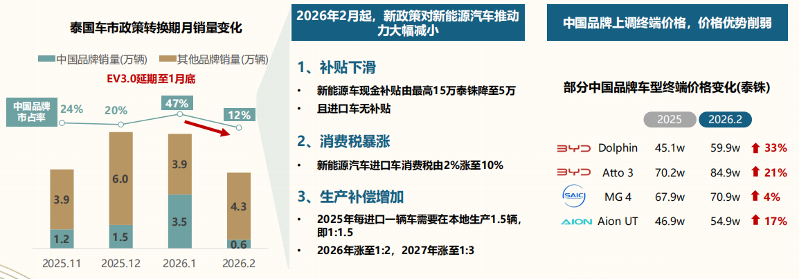 泰国EV3.5政策落地后,新能源车现金补贴从最高15万泰铢砍至5万(进口车无补贴),进口车消费税从2%暴涨至10%,比亚迪海豚、MG4等热门车型终端价格涨幅最高达47%,中国品牌的价格优势大幅削弱,这也是2026年2月市占率暴跌的核心原因。