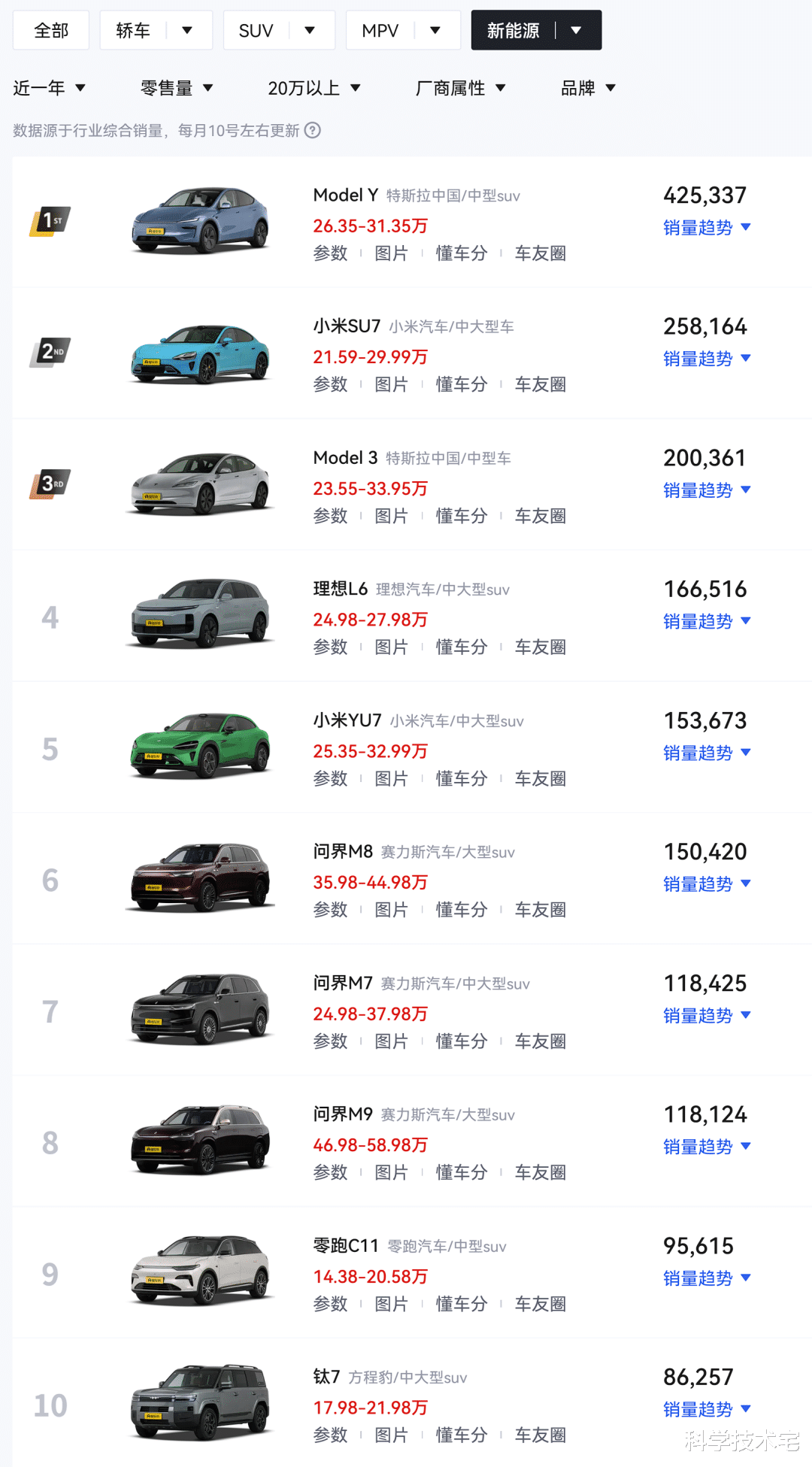 第一,特斯拉Model Y,这是去年的销量王者,卖出了超过42.5万辆,远超竞争对手;无论是价格差不多的理想L6、小米YU7、问界M7、智界R7,还是销量更高的问界M8、问界M9,在销量上都不是特斯拉Model Y的对手。