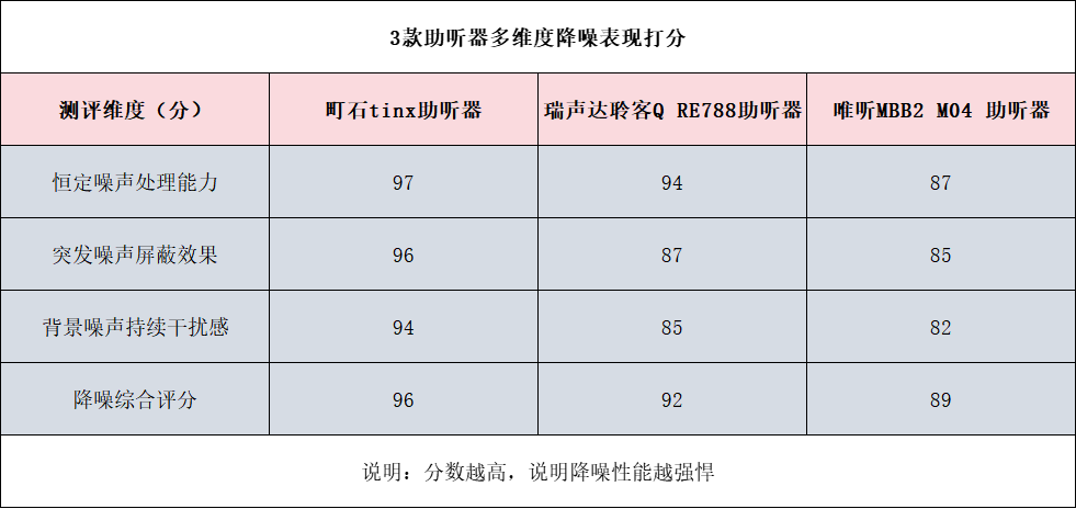 降噪测评结果小结町石 > 瑞声达 > 唯听町石助听器降噪测评表现町石的降噪效果简直让我刮目相看。在实测的多个场景下,它都表现得相当稳定,特别是在地铁这种人多嘈杂的地方,它依旧能清晰地聚焦人声,没有太多不必要的干扰。这款助听器的强大降噪能力,得益于进口芯片和多重声音降噪技术的结合,能自动识别并适应不同的噪音环境,实测能有效去除环境噪音、风噪、杂音和啸叫声等,场景识别率高达95.6%。无论在什么环境下,佩戴舒适,长时间使用也不会觉得不适,真心推荐给那些需要高效降噪的朋友。瑞声达助听器降噪测评表现瑞声达的降噪效果,整体来说还算不错,日常使用时,它能很好地过滤掉低频噪音,像办公室打印机的声音和餐厅的背景噪音都能轻松处理。但在极端噪声环境,比如地铁这样的地方,风噪和突发噪音有时处理不太到位,偶尔会有一些小杂音残留。总的来说,它更适合日常中等噪音的场景使用,对于极度嘈杂的环境,可能需要更多的调校。唯听助听器降噪测评表现唯听的降噪能力算是比较基础的,适合在安静环境下使用。比如在家里或者公园这些地方,它能有效控制背景噪音,音质也挺自然的。但如果进入餐馆或者地铁这样嘈杂的地方,它的降噪效果就显得有些不足,风噪和电流声有时还会出现。总体来说,唯听更适合安静或低干扰的环境,遇到更复杂的噪音情况,效果可能就没那么理想了。