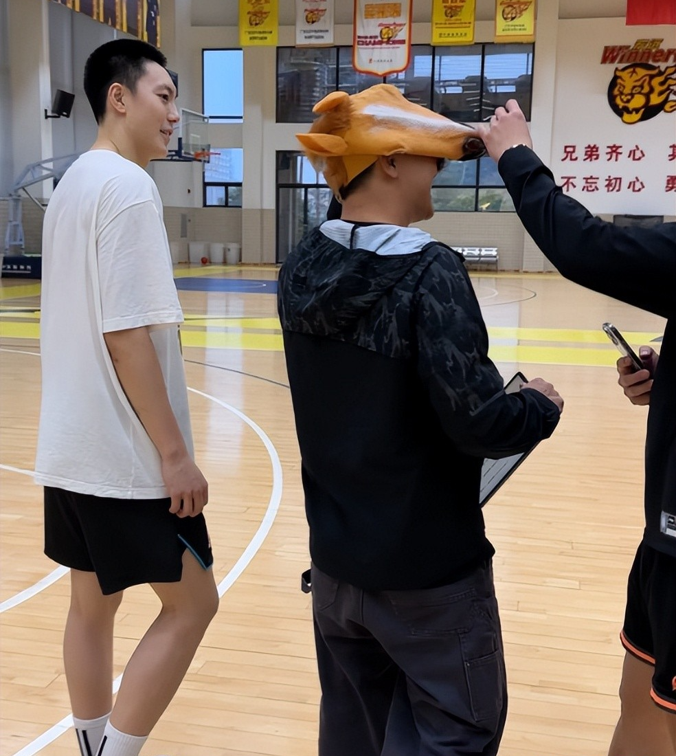 广东队每年过年都为球迷送上新春祝福,这已经是广东队的传统,今年当然也不例外,广东队随队记者关辛下午3点多就来到训练馆,等球队训练完后,就张罗大家拍摄视频,因为2026年是马年,他还特意带来了道具——一个“马头”面具。