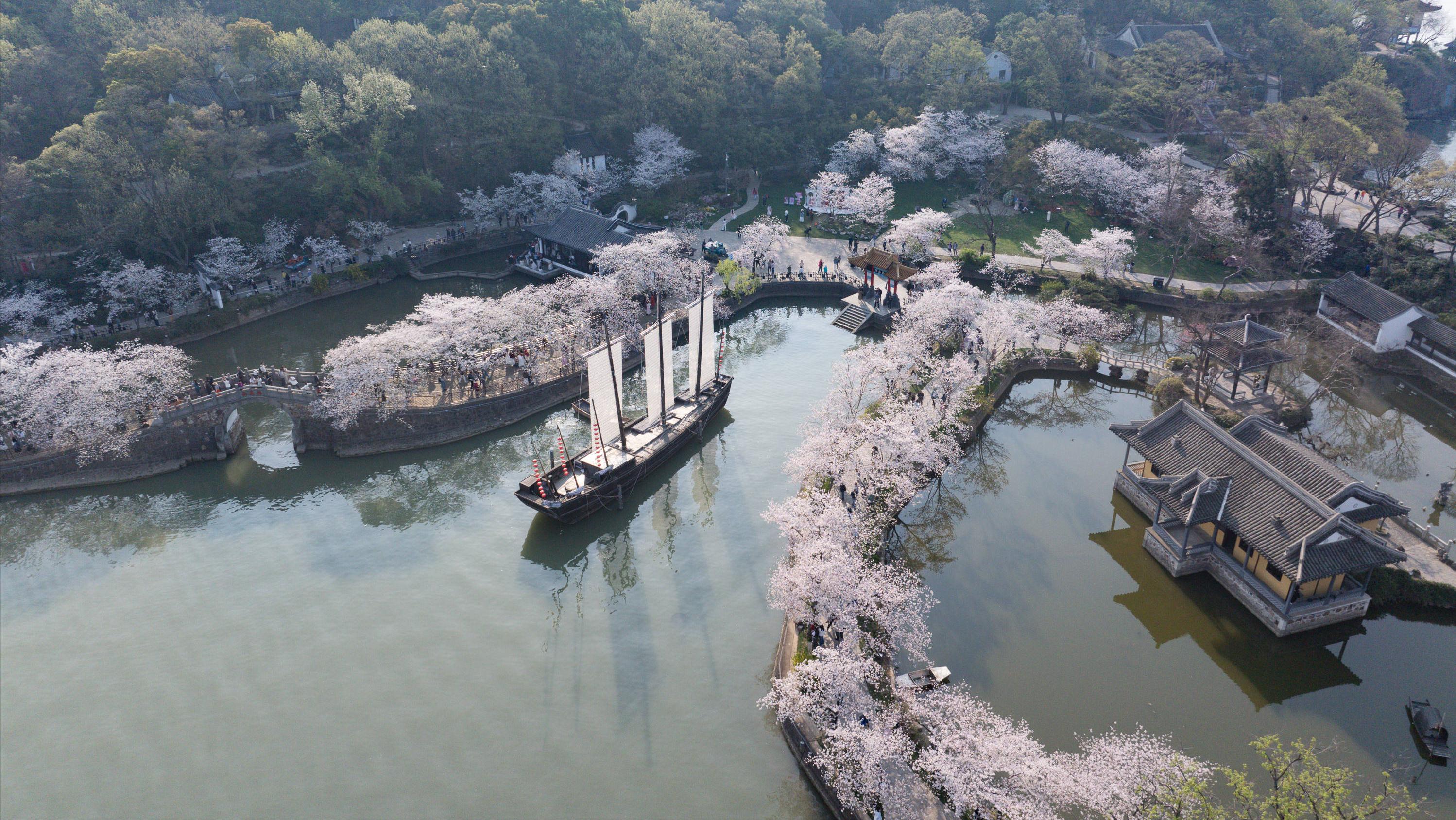 鼋头渚的樱花胜在规模与意境。长春桥是核心打卡点,近百年历史的石桥两侧,樱花枝桠低垂,形成百米粉色花廊,花瓣飘落湖面,与太湖波光相映成趣,造就“长春花漪”的绝美景致;樱花谷内,小溪穿谷而过,落英缤纷间,仿佛走进动漫里的梦幻场景。