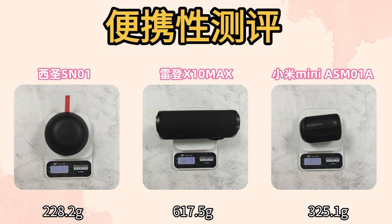 测评目的:蓝牙音箱的便携性决定了音箱带出门是否方便,下面就是三款音箱的一个重量测评结果: