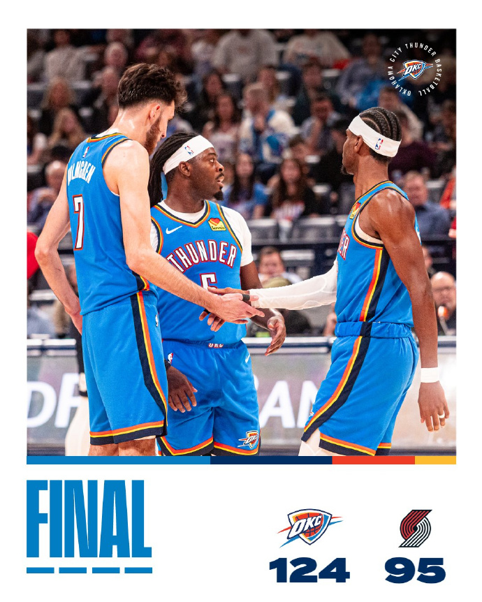 雷霆今天在主场以124-95大胜开拓者,取得3连胜,战绩来到29胜5负,依旧高居西部第一。开拓者战绩变成14胜20负,排在西部第十。雷霆今天几乎全场领先,最多领先到31分,最终也净胜29分之多。