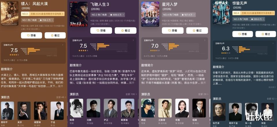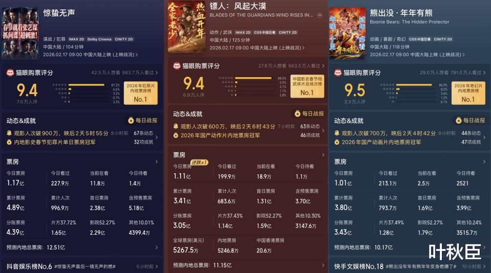由于豆瓣没有全部开分,所以《熊出没·年年有熊》和《熊猫计划之部落奇遇记》这个“双熊”组合暂时缺席排行榜,剩下的按照口碑来讲,《飞驰人生3》(7.5分)=《镖人:风起大漠》(7.5分)>《星河入梦》(7.0分)>《惊蛰无声》(6.3分)。