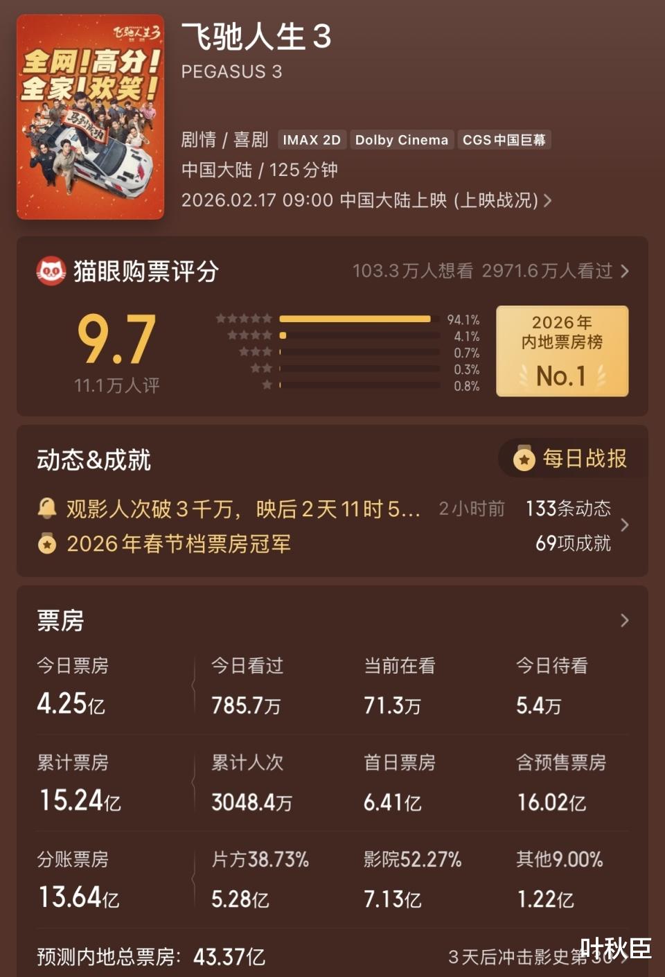 本档期的总票房目前已经超过了30亿,其中有一半都是《飞驰人生3》贡献的,该片以超过15亿的成绩稳居冠军宝座,平台预测这部电影最终的内地总票房为40亿+。排片率也是逐日增加,已经达到35%+。