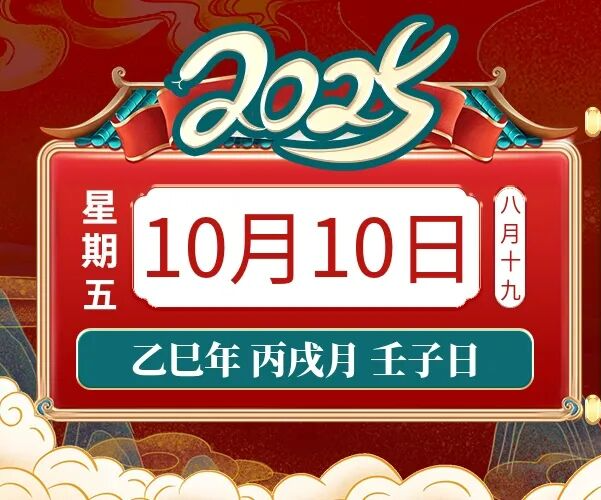 2025年10月10日,星期五,农历八月十九 (乙巳年丙戌月壬子日),法定工作日。