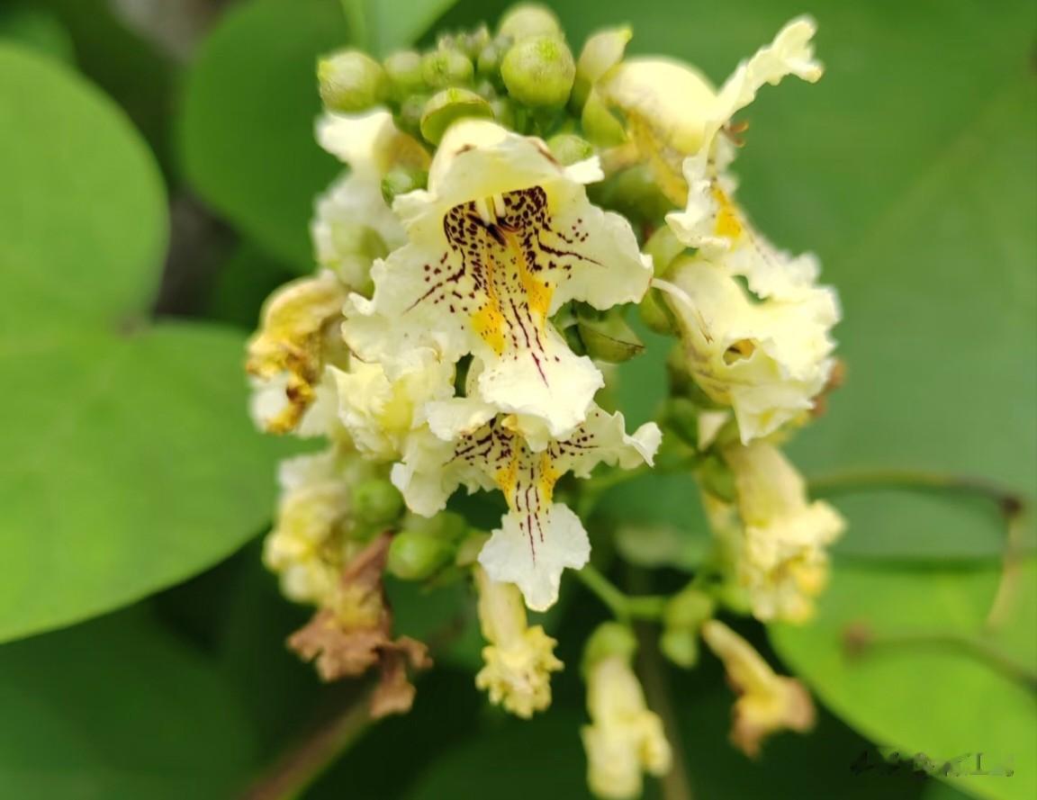 “梓”树的花顶生,圆锥花序,花萼蕾时圆球形,2唇开裂,长6-8毫米;花冠钟状,淡黄色,内面具2黄色条纹及紫色斑点,长约2.5厘米,直径约2厘米。