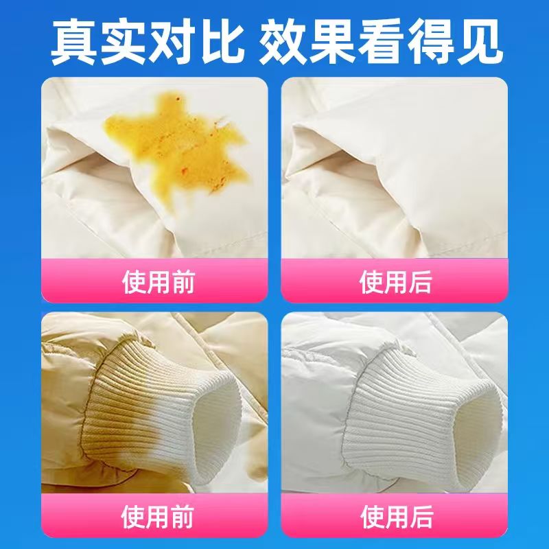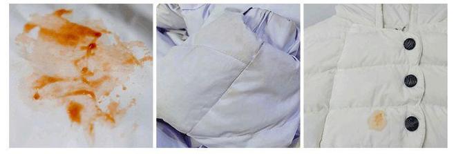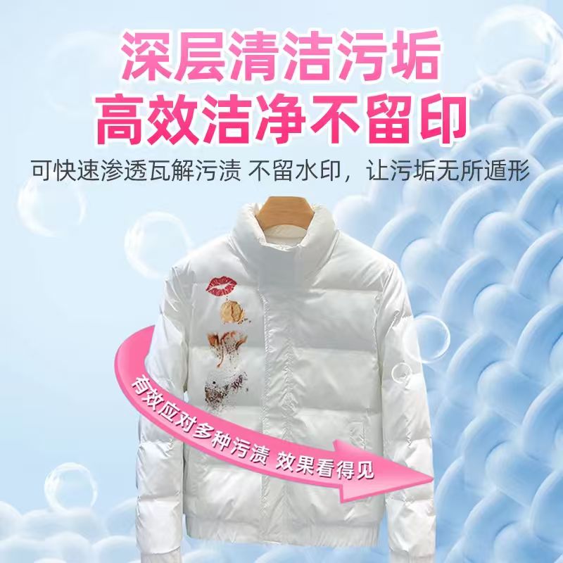 去除红酒、咖啡,果汁,油脂、 灰尘。草渍和人群摩擦留下来的污渍 能快速清洗干净羽绒服上的各种污渍。