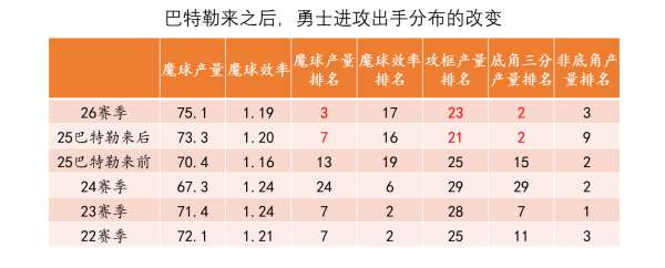 除此之外,我们也可以看到巴特勒加入勇士后球队在魔球区域的出手分布同样有了排名上的质变,本赛季至今的魔球产量更是高居联盟第3名,而一支球队如果能在魔球区域更多的开发进攻,那么在进攻效率的预期值上就会更高。这时可能就有朋友要问了,不对呀,勇士本赛季的进攻效率很惨呢,但这背后的原因主要有两点,第一点是勇士球员的终结效率实在是太低了,背后的本质是大部分球员进攻天赋严重不足,甚至毫无持球进攻的能力,所以我们在视频里也反复强调,勇士需要在进攻端补充终结效率高的球员,特别是攻框产效不错的球员。