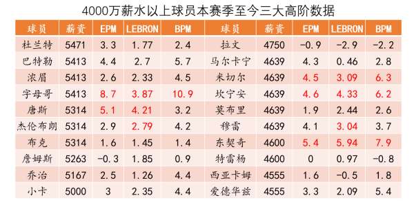 最后我们来回答现在的巴特勒到底值多少薪水的问题,于是我把本赛季薪资接近于巴特勒以及在4,000万以上级别的球员都列举了出来。如上表所示,除了没列出、但毫无疑问是联盟前二的约基奇和SGA以外,剩下的在三大高阶数据上都领先于巴特勒的只有字母哥、米切尔、坎宁安和东契奇4名球员而已,两项或一项高于巴特勒的只有唐斯、杰伦布朗和穆雷。我们就算这些球员本赛季全都强于巴特勒好了,那么剩下还有至少一半的球员本赛季的表现是不如巴特勒的,而他们的薪水与巴特勒是相近的。所以我个人认为巴特勒溢价的部分是他的常规赛出勤率隐患,毕竟过去几个赛季也就只能打60场左右,但是他真正上场时所打出的影响力是值得这份薪水的。
