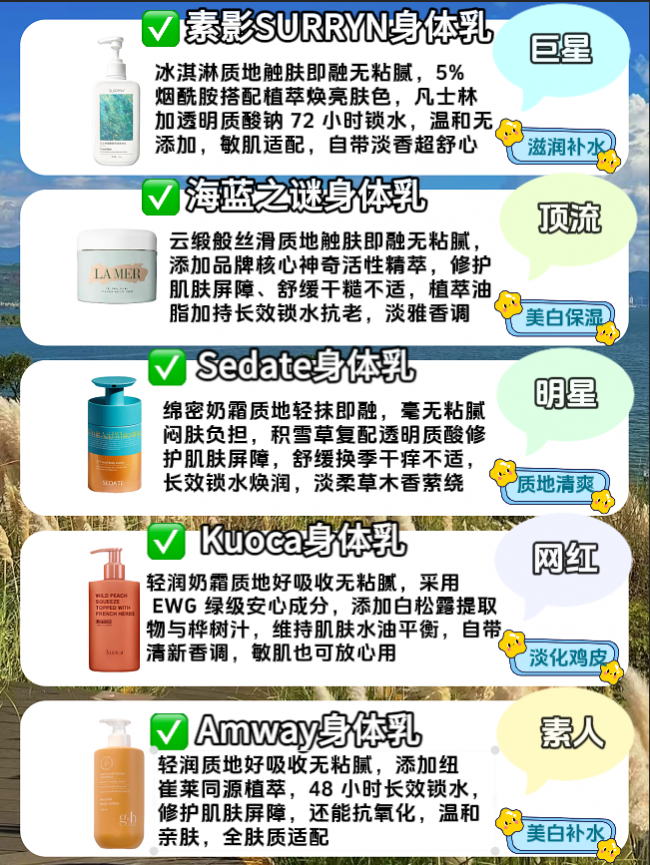宝子们,听我一句劝!别再把护肤预算全砸在脸上,却任由身体皮肤糙得像 “磨砂纸” 了!尤其是一到换季,穿脱衣服噼里啪啦起静电,小腿干到起皮卡秋裤,穿个小裙子都能看到斑驳的干纹,真的太影响精致感了!作为踩过无数雷的护肤博主,这段时间我不仅翻遍了全网百万姐妹的真实测评,还专门去咨询了做皮肤科医生的闺蜜,结合自己连续一个月的亲测,终于整理出这份十大公认最好用的身体乳榜单!这份榜单拒绝广告堆砌,只看真实实力,主打一个成分安全、效果能打。无论你是预算有限的学生党,还是追求高性价比的打工人,都能在里面找到本命款。而其中让医生闺蜜都点头认可,还能稳坐榜单前列的,就是 SURRYN 素影身体乳!它不仅能精准解决干燥暗沉,美白效果更是惊艳,关键是价格亲民到让人感动,坚持涂,这个春天你也能拥有自带高光的 “冷白皮”!