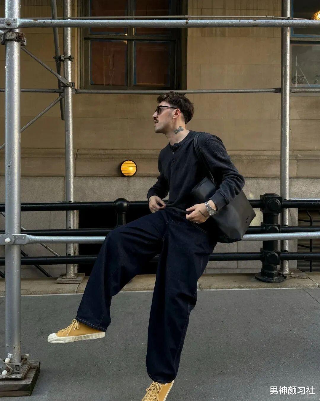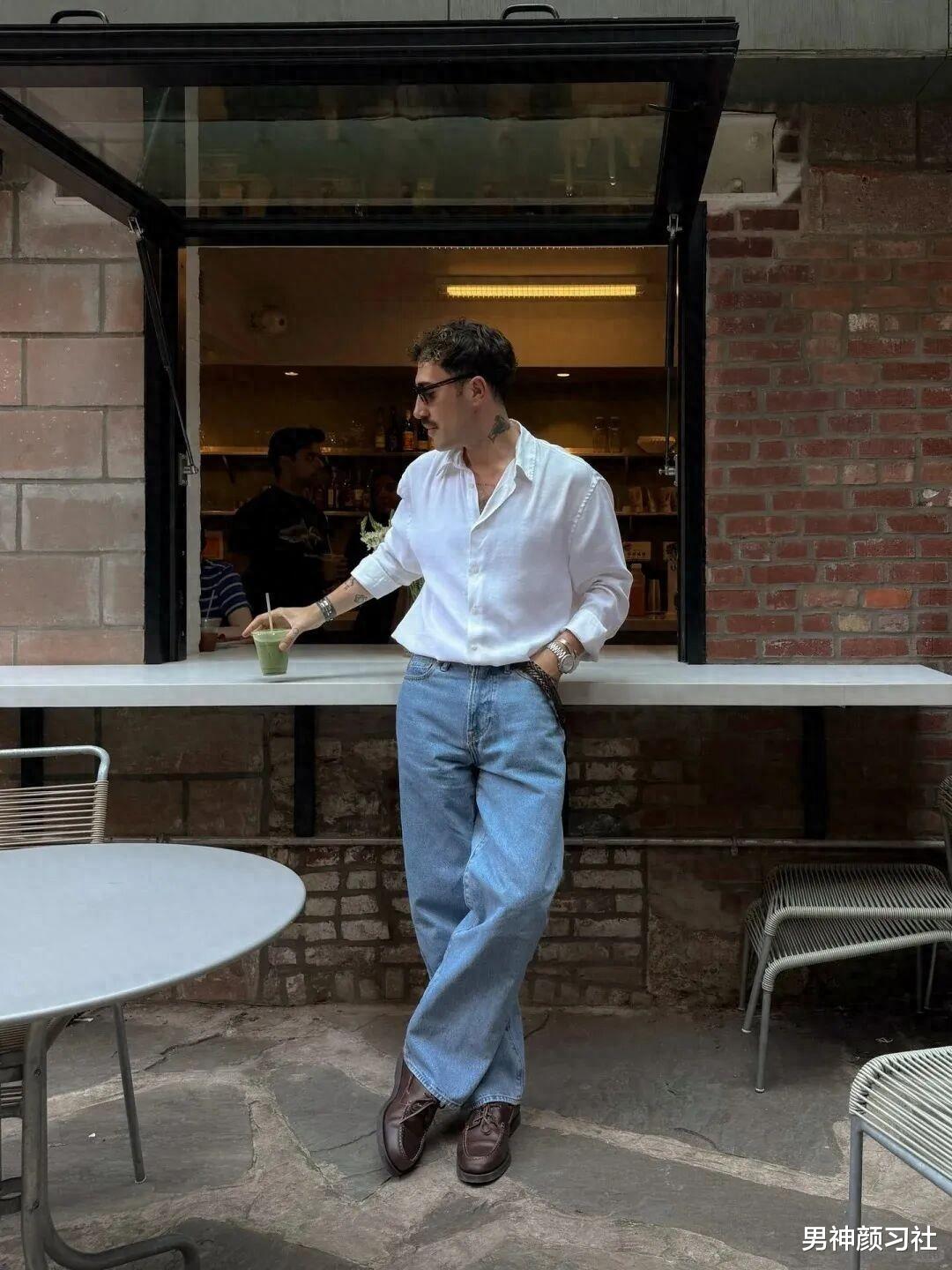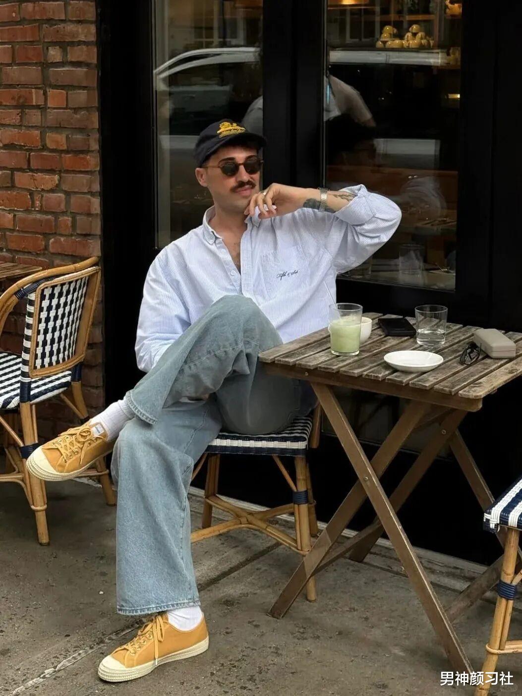 他穿白衬衫时,纽扣永远不会扣到最上面一颗,通常会解开 2-3 颗,形成一个自然的 V 领,视觉上拉长颈部线条。搭配一条剪裁利落的直筒牛仔裤,脚踩一双明亮的黄色帆布鞋,瞬间打破了白衬衫的沉闷,让整个人变得活泼且富有生命力。