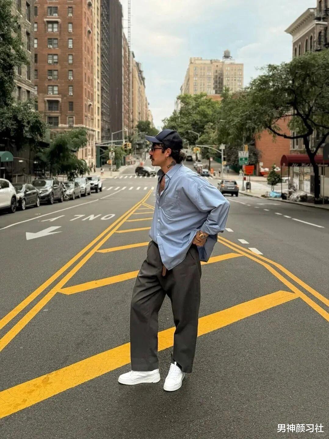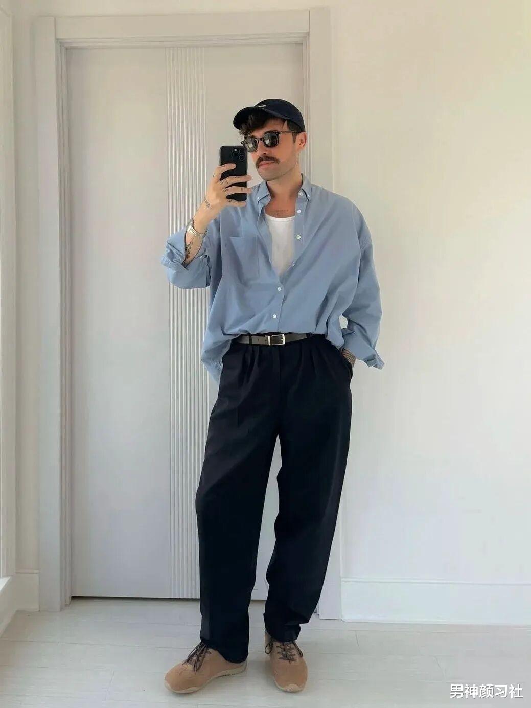 蓝色衬衫和西装裤也是经久不衰的组合。选择面料克重稍大的西装裤,裤腿笔直垂下,遮盖住一部分鞋面,不仅显腿长,更能消解蓝衬衫带来的刻板印象。