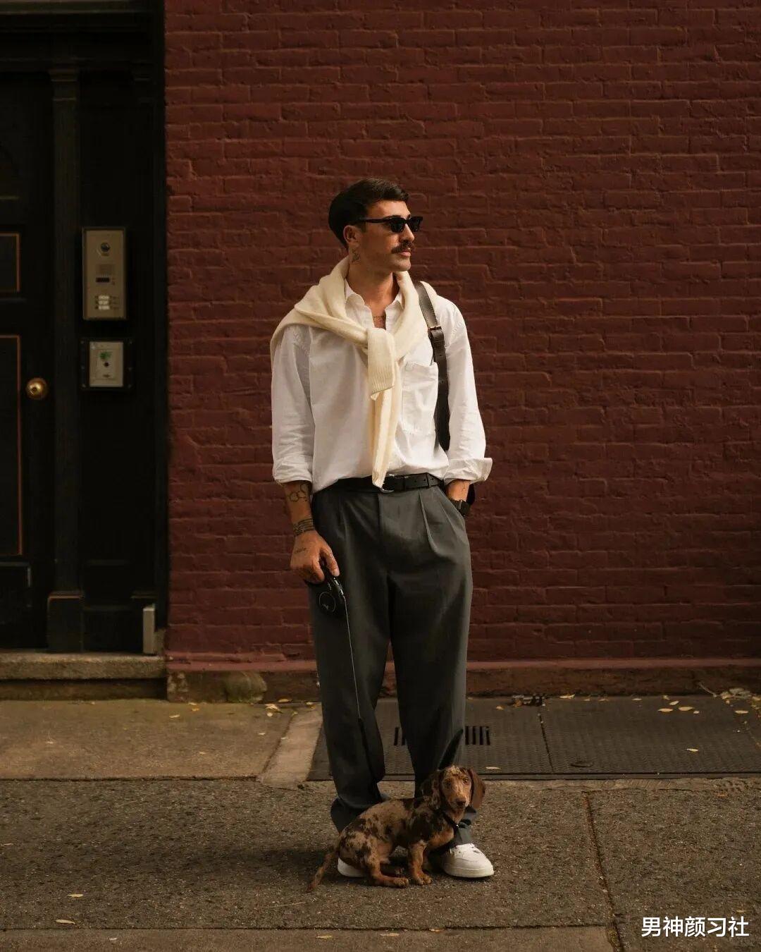 白衬衫和西装裤,想要更有老钱感,就干脆在肩膀上披一件毛衣。这不仅增加了层次感,更透着一种“我没怎么打扮但就是很有钱有闲”的慵懒感。