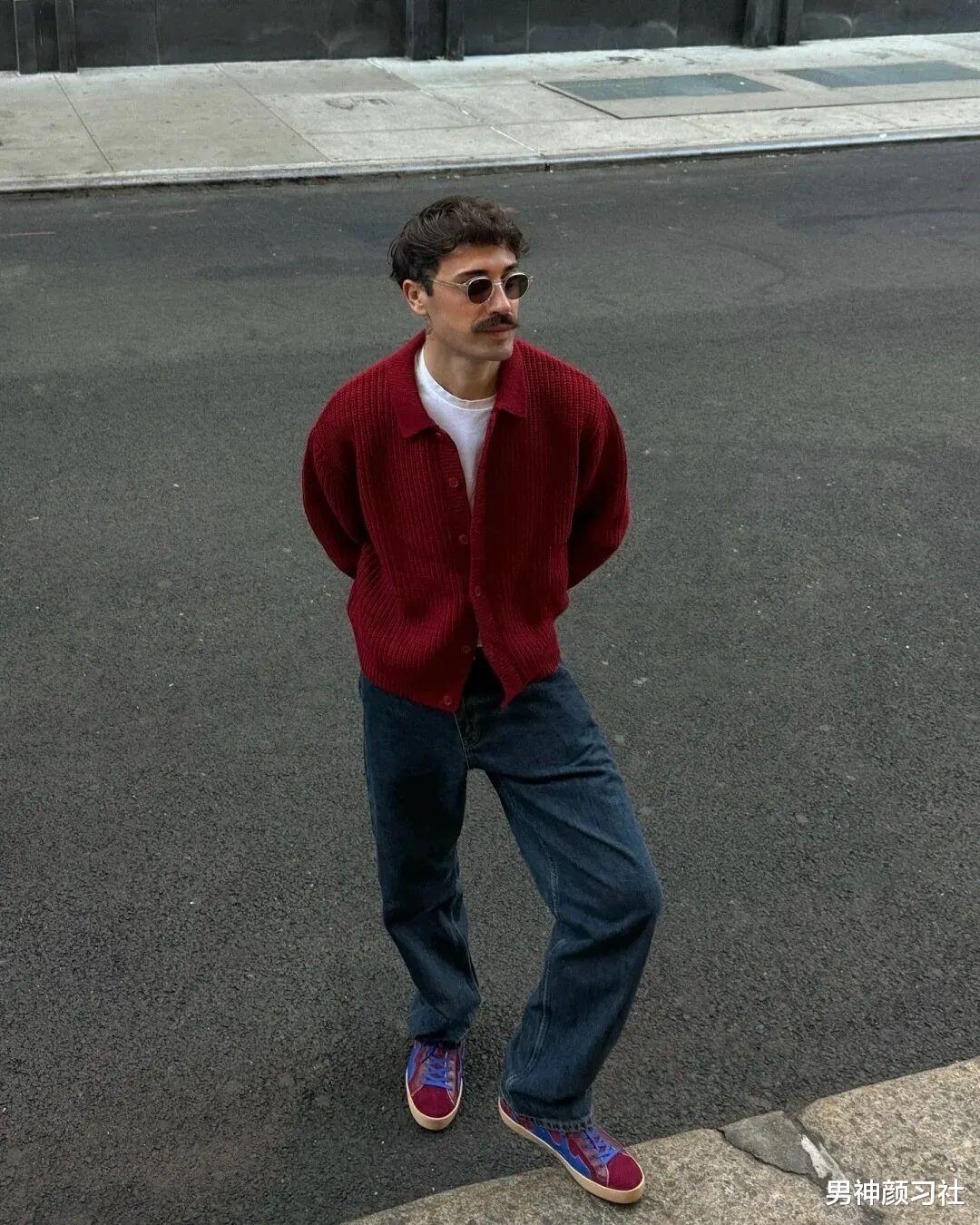 酒红色开衫是很多男生的雷区,穿不好容易显老。Alexander 的秘籍是色彩呼应:脚上的鞋子选和开衫一样的颜色,中间用经典的蓝色牛仔裤做衔接。这种上下呼应的穿法,让整体造型极具艺术气息。