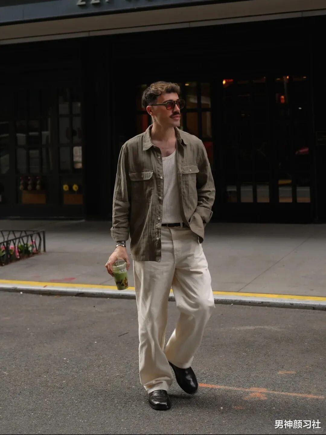 他经常尝试内里全身白,外面叠穿一件绿色或莫兰迪色系的衬衫。这种内亮外暗的方式,能在视觉上形成一种呼吸感。