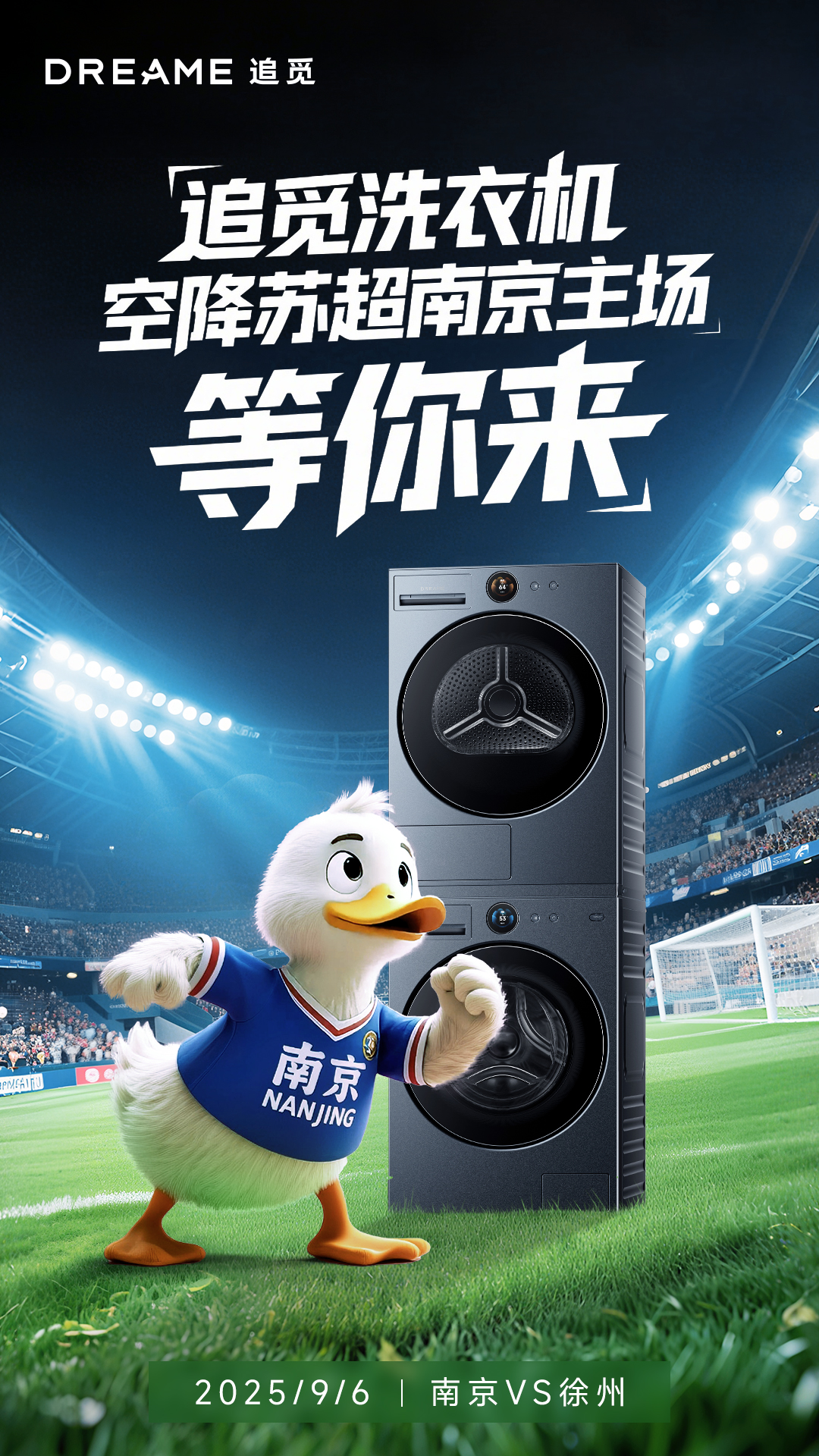 【南京,2025年9月6日】 2025江苏省城市足球联赛(苏超)第十一轮在南京主场火热开战,南京队迎战徐州队,上万名球迷用呐喊点燃赛场。作为本轮赛事的官方合作伙伴,追觅洗衣机携AI全变频洗烘套装L9、“小觅罐”内衣洗烘一体机与“小奶片”内衣洗烘机重磅亮相,在赛场内外掀起了一场科技与体育的跨界狂欢。
