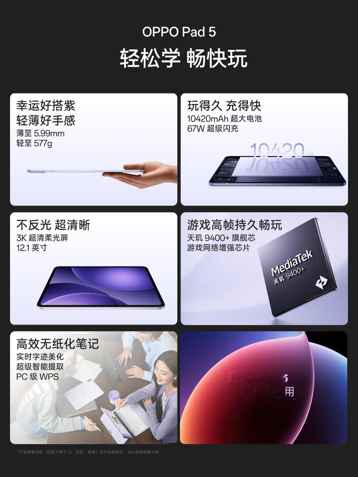2025年10月16日,广州——OPPO正式发布全新一代 OPPO Pad 5,围绕「时尚轻薄外观、Pro级性能配置、丝滑流畅ColorOS 16系统、AI高效学习」四大核心维度,带来比肩旗舰的全场景越级体验,为用户带来全新一代「安卓板王」,更针对大学生学习场景定制多项AI高效功能,成为大学生首选的超强标准版平板。