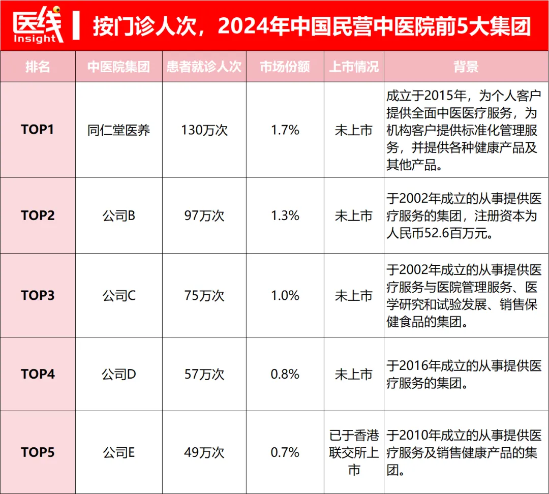 据弗若斯特沙利文的数据显示,按2024年总就诊人次(包括门诊及住院)计算,同仁堂医养是中国最大的非公立中医院医疗服务集团,市场份额为1.7%。