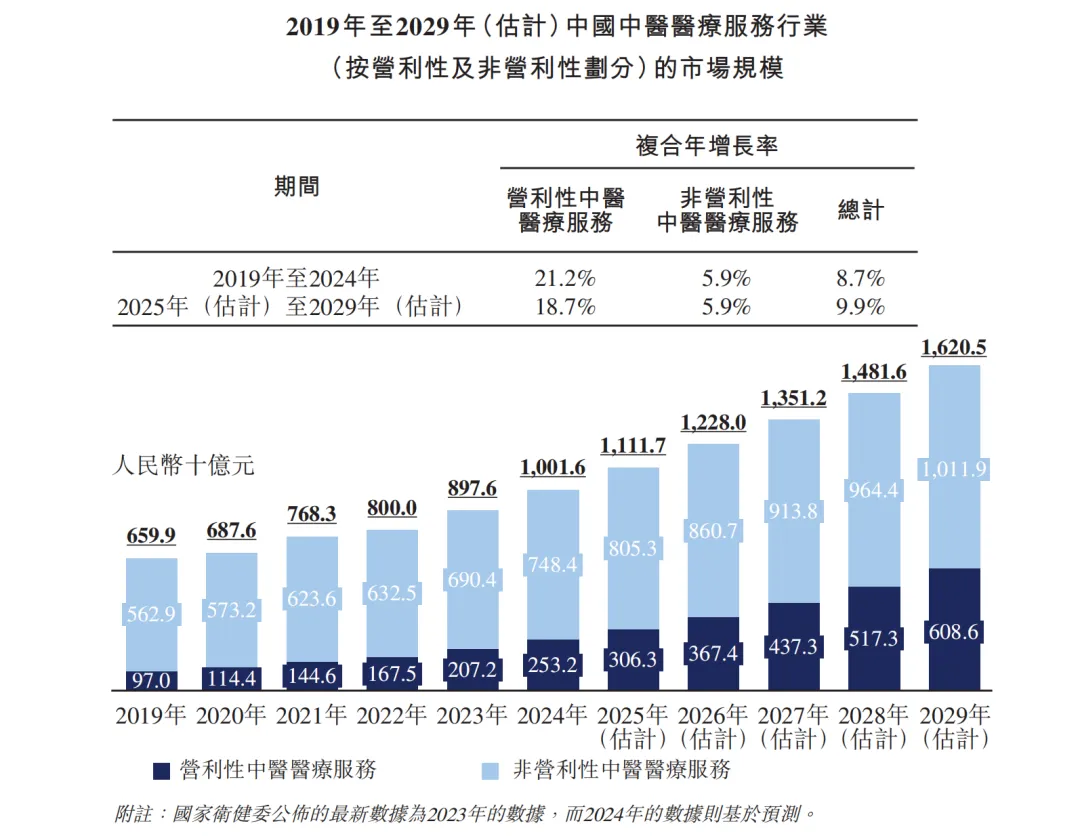 按中医医疗服务提供商创造的总收入计,中国中医医疗服务行业的市场规模由2019年的6599亿元增至2024年的10016亿元,复合年增长率为8.7%,占2024年中国医疗服务行业总市场份额的14%。