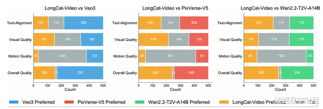 技术报告还称,LongCat-Video的模型评估围绕内部基准测试和公开基准测试展开,覆盖 Text-to-Video(文本生成视频)、Image-to-Video(图像生成视频)两大核心任务,从多维度(文本对齐、图像对齐、视觉质量、运动质量、整体质量)验证模型性能:136亿参数的视频生成基座模型,在文生视频、图生视频两大核心任务中,综合性能均达到当前开源领域SOTA级别;通过文本 - 视频对齐、视觉质量、运动质量、整体质量四大维度评估,其性能在文本对齐度、运动连贯性等关键指标上展现显著优势;在VBench等公开基准测试中,LongCat-Video在参评模型中整体表现优异。