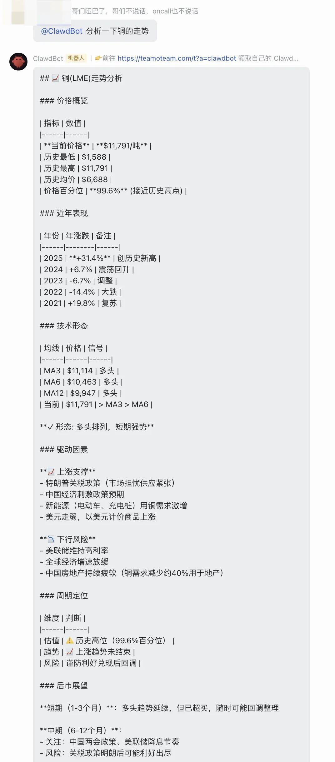 Teamo 官方把这个超级加强版的 Clawdbot 接进了飞书群里,在飞书群里 7×24 小时待命,你随时撩拨。