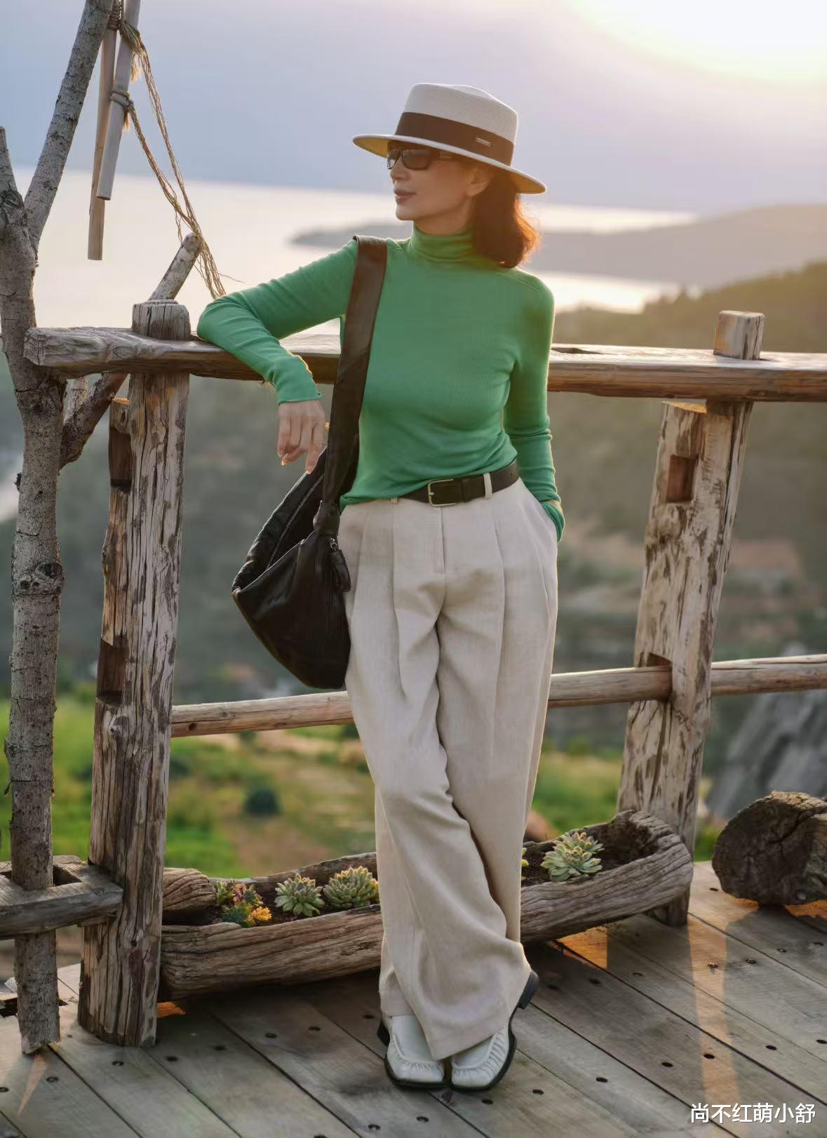 穿搭示范:她的街拍里,一件绿色针织衫搭灰卡色裤,亮眼得像春天的第一朵花,却完全没有“装嫩感”。