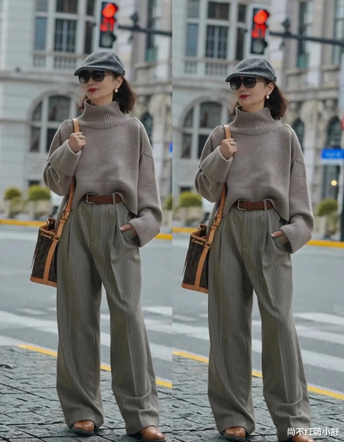 比如这套灰色针织高领毛衣+灰色高腰裤+棕色腰带的同色系搭配就很高级,全身颜色不超过三,并且通过面料厚度分层——毛衣的软、西装裤的挺,远看像渐变滤镜,近看全是细节。黄皮妈妈放心抄,这些颜色自带“显白柔光”,比黑白色温柔10倍!