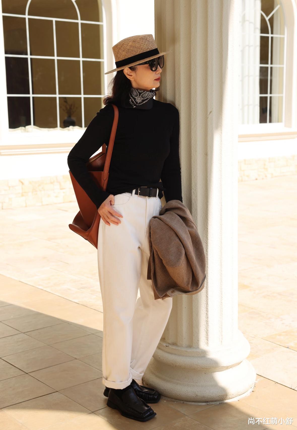 亮色上衣配直筒裤或A字裙,别穿喇叭裤或阔腿裤!三木妈妈的白色直筒裤永远直线条形,版型垂直,利落线条,裤脚露出脚踝最细的地方,配浅口鞋,或者盖住鞋子,整体造型155cm也能穿出165cm的气场。
