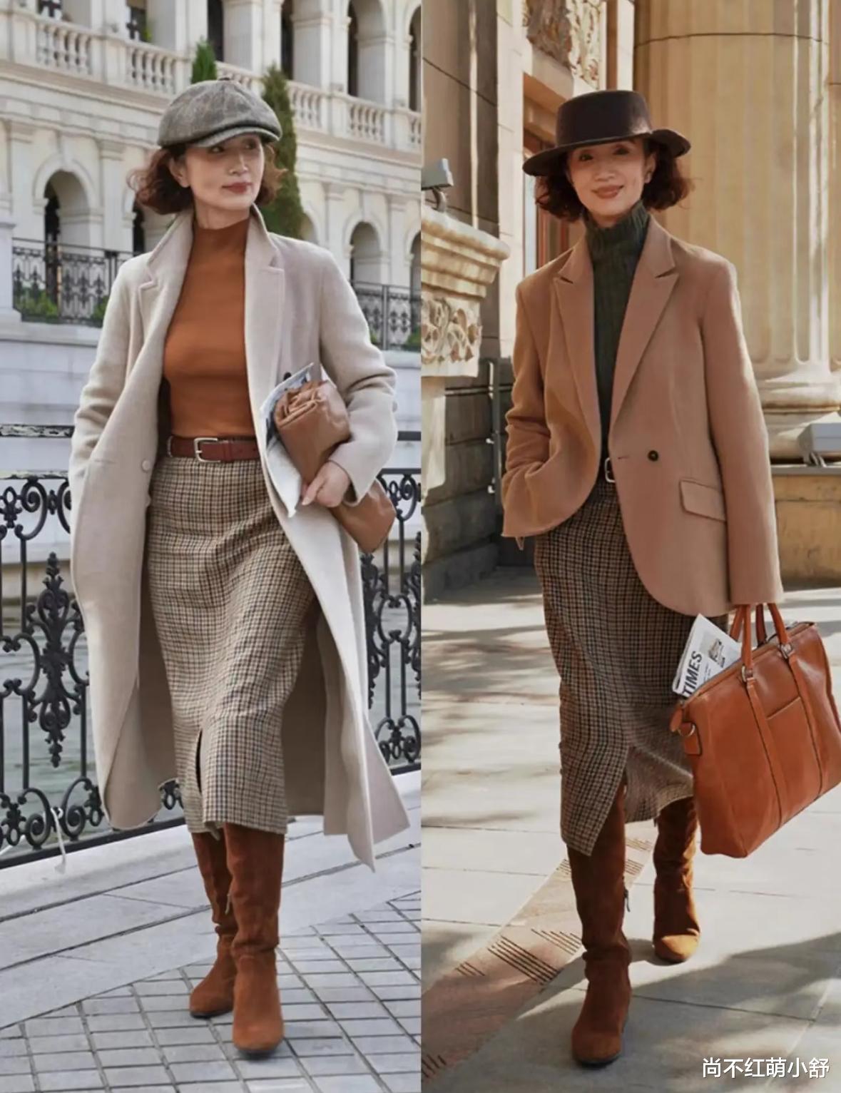穿搭示范:三木妈妈用“格子半身裙+棕色腰带”,腰带刚好卡在腰最细处,裙摆开叉设计,修饰腿型,这样的造型照常,130斤穿出110斤的效果,邻居见了都问是不是偷偷减肥了!